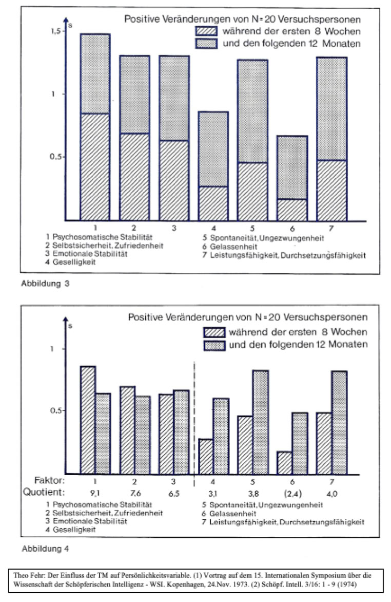 Frühe Studien: Dipl.-Psychologe Theo Fehr führte die weltweit erste Studie zur psychologischen Wirkung der Transzendentalen Meditation durch. Sie verbreitete sich rasch in der ganzen Welt. Heute haben sie vorwiegend historischen Wert, denn es gibt viele weitere Studien, die in den folgenden Jahren nach den deutlich gestiegenen wissenschaftlichen Standards durchgeführt wurden. Die wesentlichen Aussagen dieser Studien blieben über die Jahrzehnte hinweg im wesentlichen gleich. Was sich inzwischen in vielen Studien bestätigt hat, ist in den ersten Studien bereits als Ergebnis-Keim enthalten. Von daher lohnt sich die Lektüre der alten originalen Publikationen auch heute noch.